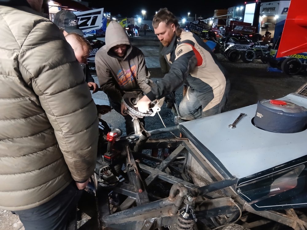 24. Pit News 8 - Repositioning the inboard end of the rear panhard rod. 138 - Power steering pump intermittent. Located a spare but it won't fit. Micky Brennan on the tools awaits his next instruction from DP 😀 552 - Ring gear within the diff stripped it's teeth in practice hence Adam's non-appearance in Heat 1