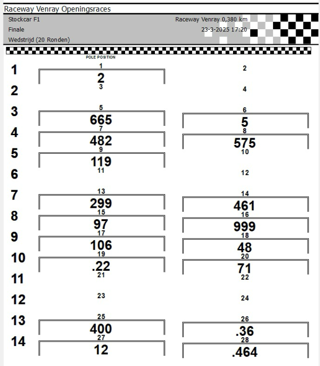 14. Grand National Championship Grid(20 cars) Row 1 - 1 16 Row 2 - 515 22 Row 3 - 446 345 Row 4 - 138 Row 5 - 526 175 Row 6 - 217 352 Row 7 - 469 453 Row 8 - 525 364 Row 9 - 127 Row 10 - 44 67 dns 95 and 463
