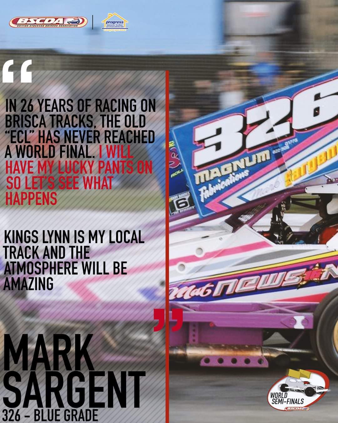 Mark Sargent's (326) journey to the World Championship Semi Final has mainly comprised of shale meetings. He picked up a number of wins during the Road to Gold and finished 2018 on a high with a points haul of 24 at the final shale meeting of the season at Belle Vue. He has continued that form into 2019 where he has picked up some more double digit points scores with Stoke in April being his best meeting giving him his highest score of 27 points where he placed 5th in his Heat followed by 2nd in the Grand Final. The 'East Coast Legend' has only had a handful of appearances on the hard stuff this season as he awaited his new tarmac car which finally debuted at Ipswich in June but of the three outings he's had in it, it's only provided a few points so far. As with most new cars, it can take time to get them to where you want them and the 'ECL' will certainly be hoping to have the car dialled in after practice tomorrow and will be on the hunt for that top 10 finish and make it onto the World Championship Final grid come next month at his local track. 🌍 World Championship Semi Final #2 🌍 Saturday 10th August 2019 @ 6pm Buxton Raceway Dale Head Road Buxton SK17 0RR Sponsored by Victory Lane Awards http://www.victorylaneawards.com/ -