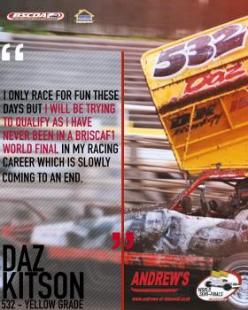 Although he only races for fun these days, Daz Kitson (532) is in the semi final and will be hoping that he can come through unscathed to secure a top 10 finish to qualify for September's World Championship Final which will be a first in his BriSCA F1 career. Daz's tarmac form has been similar to his shale form this season and he was able to pick up a 5th and 6th place finish in races at Sheffield earlier this season. 🌍 World Championship Semi Final #1 🌍 Sunday 4th August 2019 @ 12:30pm Owlerton Stadium Penistone Road Owlerton Sheffield S6 2DE Sponsored by Andrew's Coaches & Tours www.andrews-of-tideswell.co.uk