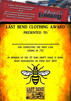 Have another £50 to add thanks to Stuart Price who has been in touch with a totally unique way of deciding where the prize will go its a little long wided so bear with me. It will to go the driver who records a time ending in .✳22 on the most number of laps e.g. 16.022 if two or more drivers achieve this it will go to the fastest lap on the night that ends in .✳22 so 16.022 would beat 16.922. The reasoning and significance behind the 22 is that Stuarts partner and daughter were at the Ariana Grande concert in Manchester on that tragic night in May 2017 and is his way of remembering the 22 people who tragically lost their lives. Total to Date £5666.14 Carried Over from 2017 £105 (P) Dave Balmer First Roll Over £100 (£50 Carried over from 2017) (P) Shoot Out Tops £475 (P) Steve Rees £200 Startrax Deborah Mayho £100 (P) Lee £30 + Winners Replica Shield (P) Paul Gerrard and Incarace Heat Money £330 Incarace Dave Wayne £20 (P) Steve Abbott £20 (P) Team Fenny £20 (P) Richard Baldwin £100 (P) RBM Adam & Nicky £100 (P) Steve, Donna and Matthew Goring £50 (P) Gary Simpson £20 (P) Peter Gleave Car Sales Limited £25 (P) Leach Motorsport £50 (P) Shaw Tyres Jake Harrhy Slowest Lap £20 (P) itsdjakey Ant Lee Team 339 £10 (P) Martin Spiers Team 451 £40 (P) Shaun Webster Team 48 £10 (P) Jamie Davidson £100 (P) J Davidson’s Carl Pickering Team 141 £5 (P) Rob Cowley Team 37 £20 (P) Colin Smith 719 along with Nigel and Steve £30 (P) Stu Shevell Team 518 £40 (P) Pete and Jane Redford £20 (P) Ian Bennett £20 (P) Steve Lowton £5 (P) Nigel Anderson £10 (P) Tony Webster £20 (P) David Collins £20 (P) Alan England Team 346 £50 (P) John Fortune Team 164 £20 (P) Teri Ann Smith First Blue home from B&S Auto’s £50 B&S Autos Stuart Ralls £15 (P) Andre Zang £20 (P) Andrew Johnson £20 (P) Gary Le Croissette £130 (P) itsthepits.co.uk Kay and Harry Fowkes £20 (P) Carol and Dougie Last Driver Home £25 (P) Derek Smith £20 (P) Mick Whittle ex F2 505 £10 (P) Les Redford £50 (P) Racin’Cargo Ricky Lee James £10 (P) F1 SHOOTOUT POINT’S 2018 Jed Masters £10 (P) Stephen North Team 80 £20 (P) Paul Carter Team 300 First Yellow Home £30 (P) Premier To Ladies prize fund £30 (P) Jackie Elwell Team 501 £5 (P) Mike Ashcroft £30 (P) Stuart Milnes Leader at Halfway £20 (P) Colin Nairn Team 280 £30 (P) Paul Harrison £20 (P) Russell Cooper First Car Picked up by Tractor £10 (P) Richard Woods Team 268 First Yellow Home £10 (P) Tommy Ferguson ex Banger 88 & Nick Bamber ex F2 828 £10 (P) Rick Rock £5 (P) Mark Foster New Bridge Chippy 839-841 Manchester Rd, Castleton OL11 2UY £50 (P) Huntapac £500 Huntapac Produce Ltd (P) John Lawn ex 441 £25 (P) Dave Crosby £25 (P) Dave Bastock £20 (P) Dave Bastock Photography Luke Dennis Team 192 £10 (P) Bobby Griffen Team 166 £50 (P) Griffin Freight Services Retford Paul Hines 259 £10 (P) Progress Windows Paul G 94 aka Mirrorman £20 (P) John Wright Team 348 £10 (P) Wayne Marshall Team 483 Driver finishing 8th £10 (P) Carrot Cruncher First White Home £10 (P) Mark Woodhull Team 335 £25 (P) Stuart Smith 390 & Family £20 (P) Rochdale Van Centre Rob and Asha Speak Skegness Stadium Raceway £100 (P) Skegness Raceway Team Makim 93 £20 (P) Derek Brown First Blue Home £100 (P) Linda, Spike, Mark, Danny, Tony and Chris £60 (P) Scottish Championship 2018 Polo Shirt £65 (P) Lee Fairhurst Racing £20 (P) Stephen Frankland £5 (P) Mark Adkins Team 24 Slowest Lap £20 (P) Team Malkin 308 Highest Placed White Top on Lap 8 £20 (P) Team Robson 267 £20 (P) Stephen Lee £5 (P) Matt Taylor £10 to Highest Placed White Top on laps 1, 3 and 5 £30 (P) Ricky Wilson Team 502 £100 Ian Steward £50 EA to First and Second Placed Blue Tops Home £100 IMS Construction Neil Scothern £100 (P) Viking Transport Ray Witts £100 (P) Ray Witts Transport Frankie Wainman Snr £5 per Lap to Driver in 5th place on laps 1-20 £100 Bryan Makinson on behalf of oval family group £50 to First Driver up the Infield Banking or First Puncture if not (P) Barry and Silvia Willis Team 337 £20 (P) Jon Thompson F2 701 & F1 312 £10 (P) 91 Panel Memrobillia £65 (P) Team 478 £11 (P) Jim Bamford 302 £10 (P) Team 172 £20 (P) Colin Goodswen 372 First Yellow Retirement £25 (P) Keith Barnard 521 £20 (P) Murray Jones 196 £20 (P) Michael Scriven 12 Twelfth place driver on lap 12 £20 (P) Stuart Croy £5 (P) Tommy Kay £5 (P) Mark Gray 224 £100 (P) Team 43 Fourth place driver on lap 3 £20 (P) Richard Earl £15 (P) Chris Cooke 460 £5 (P) Mark Sargent 326 Fastest Lap £25 (P) Kevin Speed £10 (P) 520 John Englestone £100 (P) Saxon Motors Daz Kitson D.K Race Technology £20 (P) James Morris 463 £10 (P) Jack France Top placed Yellow Lap 5 £20 (P) Team 127 £10 (P) Bill Fenwick 57 £10 (P) Paul Hopkins 278 £10 (P) Luxury Loos Team 135 £25 (P) Luxury Loos Billy Johnson 169 £5 (P) Ben Hurdman 207 Driver with most Damage or First Retirement £50 (P) MHF UK Ltd Team 495 Richard Howarth £5 (P) Team Moulds £20 (P) Team Moulds Racing The Whorton Family 408 10th Place on Lap Ten £20 (P) Tick Steward First Yellow Home £20 (P) John O’Brien 86 £5 (P) Ian Bond 431 £10 (P) Team 303 Last White Home £10 (P) Richard Howard £5 (P) 13 Kelvin Hassall £15 (P) 443 Richard Dickerson £10 (P) Steve Botham £20 (P) Richard Churchill to Youngest Newcomer who has competed in a minimum of 2 Meetings this season finish or not £20 (P) 14 Roger Bromiley for Driver finishing in 14th Place £30.14 (P) 423 Gary Jackson £10 (P) 364 Rob Plant £20 (P) 244 Mick Rogers £20 for Driver finishing in 5th Place (P) Roger Brown £10 (P) James Billows £20 Top Placed Yellow (P) J.P Logs Paul Prest £10 First Car to Spin Out (P) Chapel Motors 175 Karl Hawkins £20 (P) Andy, Lynda and Josh The Coleman Family in Memory of Jim Coleman £45 (P) Stuart Price £50 Driver recording most laps with a lap time ending .✳22 (P) Last Bend Clothing Plus Octane Booster and Cap to the top three home from Amy Web