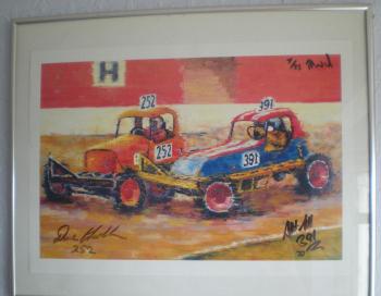 Tim Warwick did the original painting and Colin Casserley arranged 50 prints a few years ago. 25 prints were numbered and signed by Stuart Smith & Dave Chisholm. This is number 7 of the 25 signed pictures, and is framed. I will post or otherwise arrange delivery of the picture to the winning bidder and will donate the entire proceeds of the sale to the BriSCA F1 Trust Fund. Ebay require that I offer Paypal as a payment method, but I would prefer that you use a cheque or bank transfer because Paypal will deduct 3.2% of your payment and that would mean the Trust Fund receiving less. I am the original Stoxnet webmaster and administrator from back in 2002, so you're not bidding on an internet nobody's scam. I'll send the picture with one of the very very last remaining Stoxnet beanie hats from back in 2005. Bid generously!