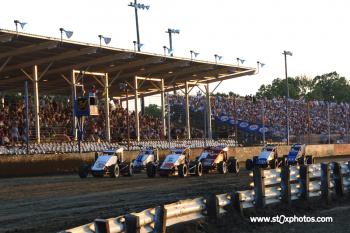 Photos from Bloomington Speedway now uploaded. They have been racing at Bloomington since the 1920s. It is a superbly prepared facility and track and the red clay track looks great in the picturesque surroundings Despite the extremely hot daytime temperature ( And night time for that matter!) the track was so well prepared that two or more racing lines were available to the drivers all night. Photos show notice board at the pit entrance. The side by side racing. The huge crowd that had gathered since mid afternoon onwards. Live timing and scoring that is on show for all to see at the United States Auto Club (USAC) mobile headquarters ( Printed heat race and final line up sheets are available there too). Cars were lined up on front straight before the final giving fans chance to see their heroes , this is Levi Jones who drives the Tony Stewart owned sprint car. Take a look at some more photos at : http://www.stoxphotos.com/photos/