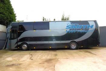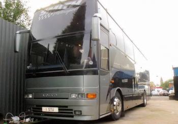 LUXURY RACE CAR TRANSPORTER BUILT ON A B10M VOLVO JONCKHEERE BODY, WILL CARRY TWO RACE CARS IN THE REAR WITH A HYDRAULIC TOP DECK, LOTS OF STORAGE SPACE FOR SPARES AND TOOLS AND WHEELS AND TYRES FOR A TYPICAL RACE WEEKEND. REAR DOOR OPENS VIA HYDRAULIC RAMS, HYDRAULIC WINCH, CHECKER PLATED REAR SO CAN BE WASHED OUT, LOTS OF STORAGE UNDERNEATH WITH BOTT SYSTEM AUTOMOTIVE SHELVING AND DRAWERS FOR SPARES AND FURTHER ROOM FOR EQUIPMENT IN LOWER LOCKERS TOO. 6 KVA GENERATOR POWERFUL ENOUGH TO USE A WELDER!! LIVING AREA SEATS 12 AND SLEEPS 9, WITH SHOWER, TOILET AND SINK WITH STORAGE FOR TOILETRIES AND TOWELS, GAS OVEN COOKER, MICROWAVE, FRIDGE, SINK, HOB, AIR CONDITIONING, TV DVD AND SATELLITE DISH WITH SURROUND SOUND, LOTS OF STORAGE THROUGHOUT. THIS WAS BUILT OVER TWO YEARS AND IT WAS A LABOUR OF LOVE DONE TO THE HIGHEST STANDARD AND CARE. A SUPERB MACHINE THAT HAS EVERYTHING FOR THE RACE WEEKEND OR EVEN AS A LUXURY MOTOR HOME WITH ROAD CAR IN THE REAR. THANKS.