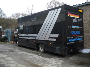 As you can see, it's a Mercedes on a 1994 plate , 7.5 ton, rear converted by Reedman, front professionally fitted out by professional caravan builders 1st class job!Sleeps 6, seats 8 all comfortably, shower,wc, hot and cold water, 12v dc and 240v ac, electric hook up, microwave, hob and grill, sink,tv.water tank.rear will fit F1/f2 etc ready to take yo racing will listen to reasonable offers around £11k inbox me if your interested or mail info@waynehelliwellracing.com or text/ ring 07920465971