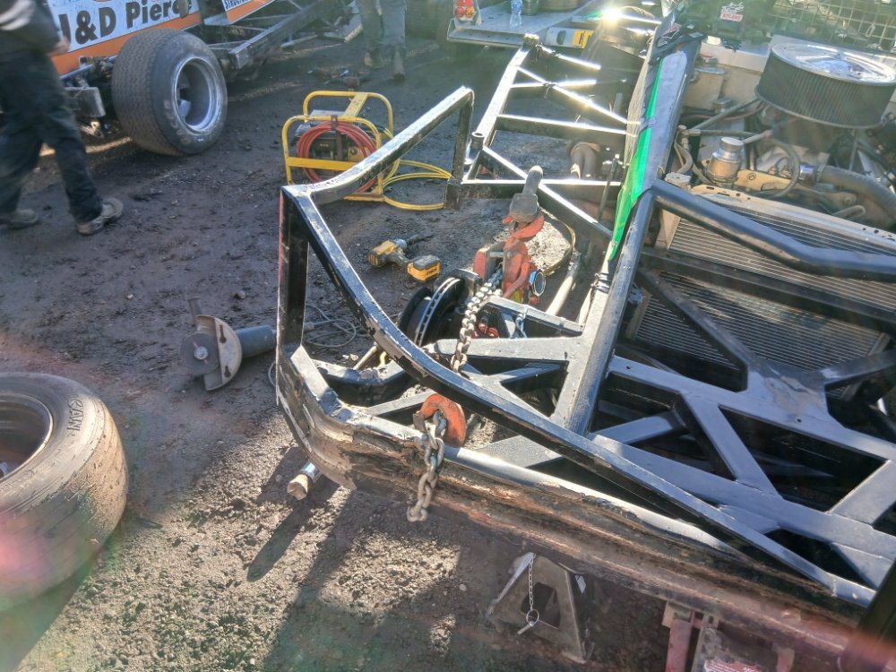 Pit News: A busy time for a few teams: 349: 8: 368 after a coming together with 515: Likewise for 515: 217 front axle damage amongst other things: 595 loading up (chassis damaged): It is difficult to see here but the side of the main rail is distorted 96 also loading up -