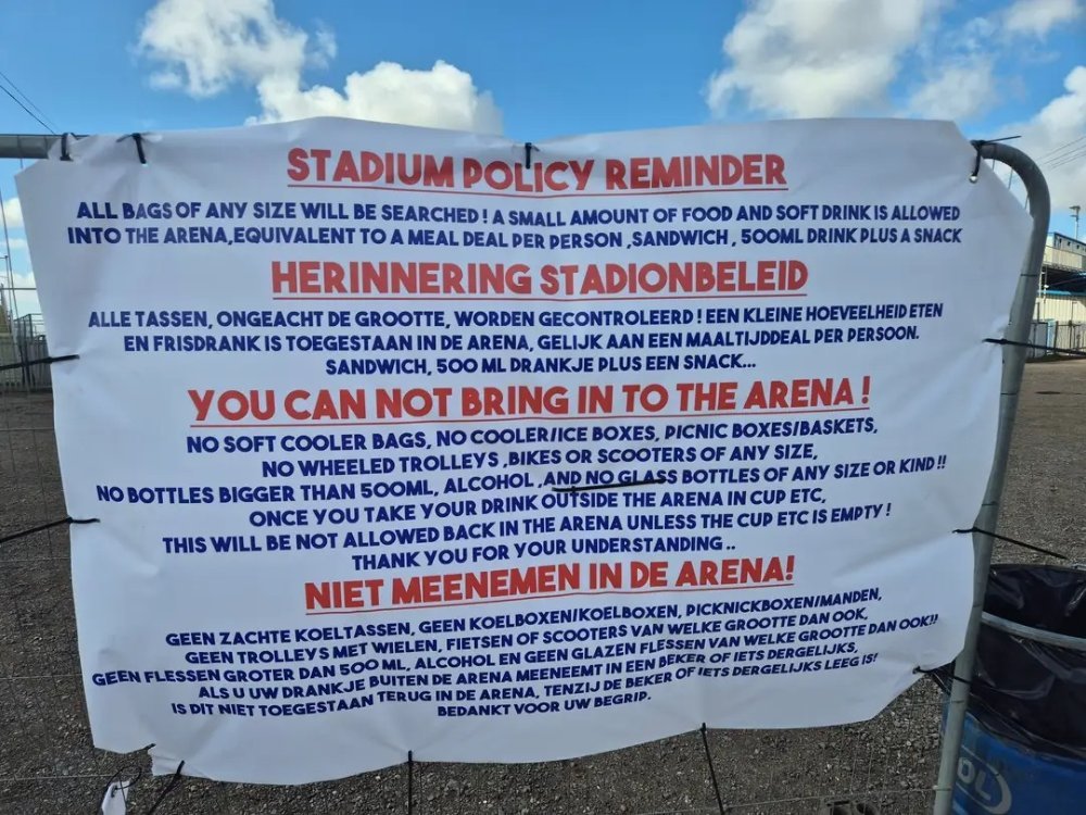 Rules to follow before you are allowed to enjoy your weekend. The limit of a 500ml bottle of drink (even water) per person is being strictly applied. If you take more it will be confiscated. The weekend costs enough as it is without being forced to buy food and drink inside. Then they wonder why crowds are dropping off 🤷♂️