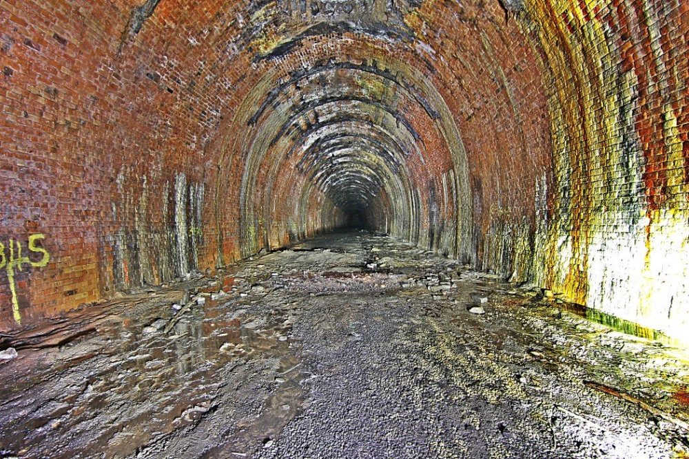 5. Continued from above: As it used to be The scene today The tunnel portal soon comes into view and we can very carefully walk onto the parapet high above the cutting. A number of coping stones have fallen down below so it’s a case of making sure you don’t do the same! As we make our way down the 70ft high embankment we enter the land that time forgot apart from the remains of an early 1980’s Ford Fiesta engine and suspension. As we get nearer to the portal an exposed part of the tunnel drainage appears. Accessed via catchpits an overworked 12” drain runs beneath the centreline. A side channel has collapsed with the corresponding centre catchment drain uncovered. A jungle and double fence are our next obstacles to overcome. No thorns or brambles this time though. This east portal is an imposing brick structure although it looks rather lost at the end of the vast cutting. It comprises two substantial buttresses either side of the entrance and an unusually high headwall. What remains of the copings are ashlar, as is the projecting keystone. At the arch face are ten brick rings, needed to withstand the ground forces being exerted on the tunnel. Immediately beyond the portal, the lining - which necessitated the manufacture and laying of five million bricks - is in a poor condition, with short sections of sidewall having collapsed. A 12-inch square beam - formerly one of three - still straddles the tunnel between its haunches. These were used to strengthen the portal. There are some big cracks in the tunnel roof in this area. The shape of the tunnel mouth is sagging slightly with subsidence and general age. As we enter the tunnel two of the three support beams are laying at our feet. The ends have rotted through and they’ve come crashing down. The decay to the brickwork of the tunnel sides is unimaginable in this area. Extensive spalling owing to water ingress has affected it to such an extent that a single row of bricks is all that is holding the lining in place. Let’s move further in away from the huge cracks in the roof. The crown of the tunnel has additional support in the way of iron ribs linked with poling boards. However, these are not in the best of condition either with the disintegrating wood and the corroded iron. Blue engineering brick has been used throughout with repairs in red brick. The roof is black with soot in places. There are plenty of refuges some of which reveal the exposed rock behind. 100yr old tool marks can be seen on the rock. Even these have suffered the ravages of time though with a few that are crumbling and collapsing. Continues below:
