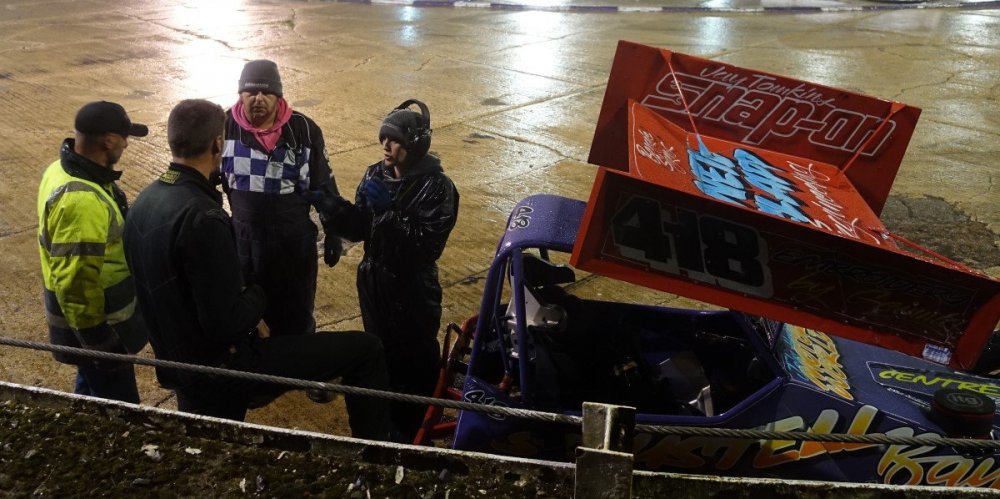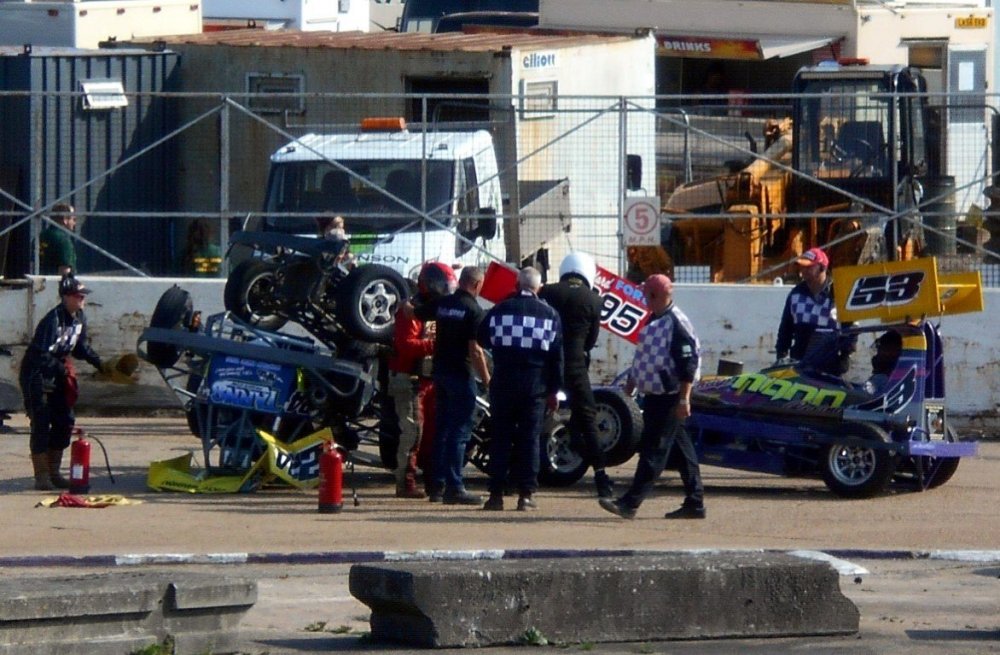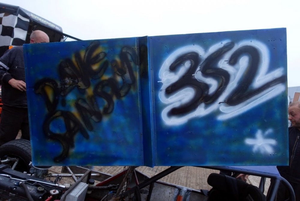 2. Continued from above: Last time we were here Dave won the Final which saw an upgrade to blue. No messing about with a vinyI wrap for Dave when a quick fix with a spray can does the job. F2 Heat 1: The rain set in just before start time which made for some frantic changing of tyres and set -up for those involved in this opening race. Sansom continued his fine form since returning to racing by quickly cutting through from the blue grade to lead, dumping early leader Adrian Watts (222) into the wall in the process. British Champion Steven Gilbert (542) who was excelling in the wet conditions eased 352 aside as the caution came out for Watts. Jon Palmer (24) had slid into the parked 222 car. The rest of the race was fairly quiet, with Gilbert claiming the victory. On the final corner Matt Stoneman (127) spun Samson from second place. As the pair scrambled to get going again Justin Fisher (315) nipped past for second, with Sansom managing to get third as Stoneman spun across the line in sixth. Result: 542, 315, 352, 418, 24, 127, 783, 210, 736 and 538. Heat 2: Conditions had worsened for this one leading to plenty of spinners. Sansom again quickly hit the front before Borthwick nosed inside. The Semtex Kid then lived up to his reputation with a massive hit on the 418 car entering turn one. This was payback from an incident at United Downs the previous day. Both cars hit the plating extremely hard. Whilst Dave remained in his car Ben decided to get out for a chat until the trackside officials advised him to get back in. Palmer was there to pick up the pieces and he won from Aaron Vaight (184) who had spun Ben Goddard (895) from second. Result: 24, 184, 895, 539, 538, 915 and 942. Heat 3: Having crashed out of heat one Paul Rice’s (890) wet weather skills came to the fore in this race as he scythed through the field pushing Tristan Claydon (210) wide for the lead, then holding off Gilbert’s determined challenge after a caution to recover Fisher. James Rygor (783) and Chris Mikkula (522) had a good scrap for third. Result: 890, 542, 783, 522, 184, 895, 127, 539, 210 and 920. Final: Just fifteen cars had survived for this with all but three being stars or superstars. As Julian Coombes (828) led, Borthwick and Fisher headed the star grade charge. Fisher moved ahead at halfway as the 418 car dropped back with a puncture. Coombes lost the lead in a Honiton bend heap which left Fisher with a healthy lead over Palmer and Rice. This pair gradually caught 315 owing to him having to negotiate back-marking traffic. With one lap to go the 24 car launched his attack on Fisher. It was too hard though as both went in and got caught on parked cars. 315 became terminally stuck, whilst Palmer recovered for an eventual third. Rice gratefully slipped through for the win becoming the first man to claim two finals at the track this year. “I did the job a bit too hard really!!” admitted Palmer in something of an understatement in his post-race interview, adding that in those conditions, “it’s hard to judge”. Winner Rice said, “I do like the wet conditions,” agreeing that ,”I think Jon did me a favour there.” Result: 890, 783, 24, 542, 184, 895, 736, 418, 539 and 538. GN: With conditions taking their toll just eight hardy souls took to the track. In an inevitably quiet race Rygor took the win from Palmer and Vaight. Final winner Rice made it up to sixth from the lap handicap. Result: 783, 24, 184, 542, 210, 890, 539 and 736. Saloons Stock Cars Despite there being only thirteen cars they served up a trio of very entertaining races on the tight concrete raceway. The wet conditions helped to spice it up further. Heat 1: Guest driver Bradley Fox (162) was hit from pillar to post in this race. Ian Govier (28), Junior Buster (902), Ben King (276) and Charlie Lobb (980) also got heavily involved in the rough stuff with some ferocious bumper work-the latter two in particular seemingly intent on destroying one another rather than actually trying to make forward progress. Caution flags to assist Govier with five laps to go wiped out Cole Atkins’ (399) big lead but he was able to ease clear once more for the win. Phil Powell (199) executed a perfect last bend move on Billy Smith (161) to take second. Result: 399, 199, 161, 476, 799, 277, 902 and 319. Heat two: Atkins dominated this quieter race to win from Richard Regan (319). Powell again outfoxed Smith on the last bend, this time for third. Result: 399, 319, 199, 161, 799, 476, 902, 277 and 162. Final: Regan put up a bit more resistance to Atkins in this race before the 399 car pulled away once again. Smith and Powell made faster progress through the pack this time and were reeling in Atkins in the closing stages only to run out of laps. Atkins took his sixth win in two days and was followed home by 161 this time who held off the last bend charge from 199. Result: 399, 161, 199, 476, 902, 799, 277, 130 and 162. Pics in the gallery. Continues below: