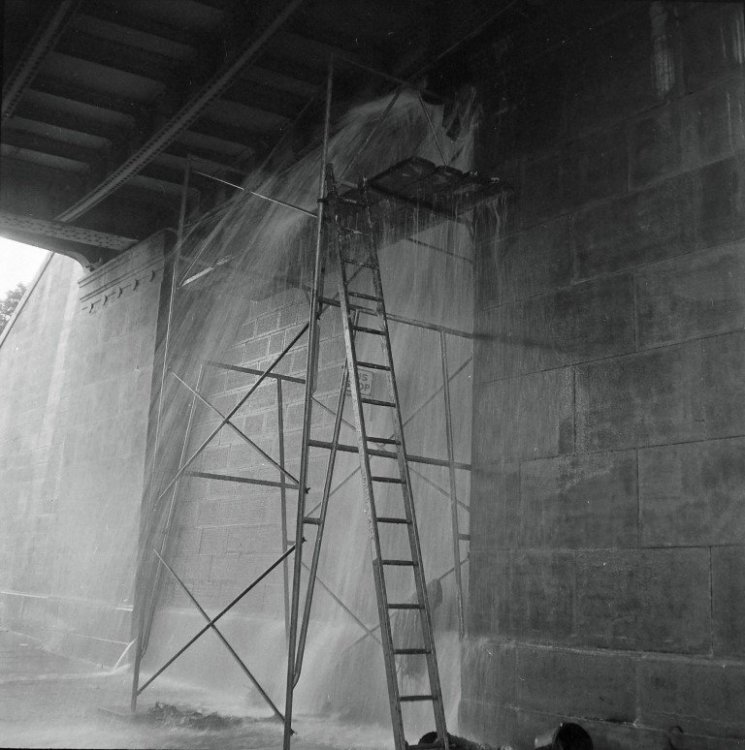 15. Continued from above: In designing the scheme, and in the sequence of operations, due consideration was given· to enable both canal and highway traffic to be maintained throughout. The whole of the temporary works gave satisfactory service, and 2,689 barges were successfully passed through during the eight months such works were in commission. A traffic census taken for the week ending November 7th, 1926, showed that about 20,000 vehicles passed under the aqueduct during that period. The scene at completion and in 2020. The background has changed from those early days. The old hotel has gone to be replaced by a roundabout. In November 1967 maintenance work was being carried out on the canal above. Silt and rubbish that had collected over the years needed to be cleared. This required partial draining through a valve in a pipe buried in the stone wall. However, the valve was blocked and sprang a leak creating a water-fall into Yorkshire Street. Continues below: