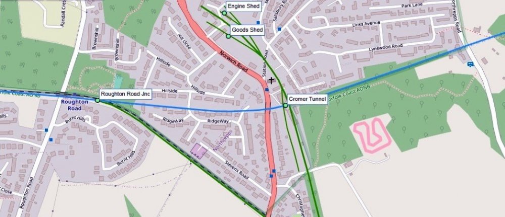 25. Continued from above: Let’s have a look back at the local railway network now. It is a bit complicated at first owing to the layout and number of stations, junctions etc. A few attached maps, and reading it a few times may help hopefully. The GER and NSJR both converge to the south at North Walsham The East Norfolk Railway obtained an Act of Parliament in 1872 to build a line from Norwich to Cromer which opened as far as North Walsham on the 20th October 1874. Initially it comprised a single track line that was extended to Cromer in 1877. In 1882 the ENR was incorporated into the Great Eastern Railway who had operated the line from its opening. This map shows the stations This one the junctions In 1906 a new line was opened from Cromer Junction which was south of the GER terminus at Cromer High station. This line made a connection to the Norfolk and Suffolk Joint Railway at Roughton Road Junction. Passing there a train came shortly to Newstead Lane Junction where a left fork took a GER train around to Runton West Junction, and to Sheringham on the Midland and Great Northern line. A right fork took the N&SJR to Runton East Junction and into the M&GN terminus at Cromer Beach. Cromer once operated up to four railway stations at various times over the years, that of Cromer Beach, Cromer Links Halt, Cromer High and, latterly, Roughton Road – all within an apparent complicated rail system which became simplified when closures took their full effect. Now the town has just two – Cromer (former Cromer Beach) and Roughton Road which opened in 1985, near the site of the former Cromer High station. Roughton Road came into existence following the town’s growth as home for a growing number of Norwich commuters. This particular expansion was, of course, in complete contrast to the 1950’s and 60’s closures which followed the fall in traffic caused by Cromer’s decline in popularity as a holiday destination after World War II. At that time, there were also closures of many other Norfolk railway lines. The knock-on effect of this was that an inevitable early decision was made to concentrate all Cromer passenger traffic towards, and from, a single station. This was to be the former, and centralised Cromer Beach station, built in 1887 for the M&GNJR. This station was simply renamed ‘Cromer’. However, there is a hidden gem which will surprise those who believe that the county of Norfolk is completely flat. Cromer, in fact, has a tunnel, which normally would not be necessary if there were no hills to tackle. That tunnel still exists, neglected and almost forgotten, and is the only standard gauge railway tunnel in Norfolk. It was built to carry a single track by the Norfolk and Suffolk Joint Railway to take their Cromer Beach to Mundesley line underneath the Great Eastern’s Cromer High to Norwich line. The location of the tunnel Continues below: