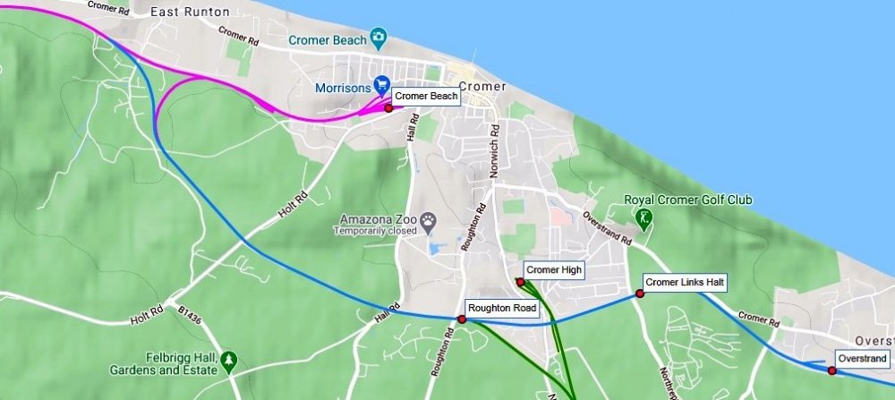 22. Continued from above: Onto our last destination of the day now. We’re heading in the opposite direction back along the N&SJR to the village of Overstrand. As we pass back through Cromer tunnel the line turned south-east and followed the little-used extension line to North Walsham. The first place we come to is Overstrand, situated in ‘Poppyland’, so named for the poppies that grew in the fields and along the lineside. The village is on a cliff-top and was first established in the ninth century, long before it appeared in the Doomsday Book of 1086. It is recorded as Oxstrand and shows that King William gave the village to the captain of the cross-bowmen of his victorious army. Its name means ‘over or above the shore’. Cromer lighthouse was built in 1832 on the Overstrand hills. During the late 1800’s a writer for the Daily Telegraph wrote a series of articles about the village and surrounding area. They attracted the attention of the wealthy and famous. With the coming of the railway in 1906 they were joined by authors, poets and actors who came to enjoy the pleasures of the village. Many of them built houses there and it became known as the ‘village of millionaires’. Most of these houses are still standing together with the sites of some that have fallen into the sea, or have been destroyed by fire. These are just some of the properties with interesting links to their past occupants: Overstrand Hall was designed and built by Edward Lutyens in 1901. He designed and built over thirty major English country houses, and created over one hundred gardens. He designed the Cenotaph in Whitehall, and many other memorials and cemeteries for the Great War. The hall was used as a military hospital during WW1. Overstrand Cottage dates from 1750 and was purchased by rider John Maunsell Richardson. He won every steeplechase in England twice including the Grand National in 1873/4. The Grange has been owned by some influential people. It was built in 1903 for the manager of London’s Garrick Theatre before being subsequently purchased by Sir William Player the tobacco magnate. He in turn sold it to Sir Jesse Boots founder of the pharmaceutical company. Pear Tree Cottage was occupied in the summer leading up to WW1 by Clementine Churchill wife of Sir Winston Churchill. His mother Lady Randolph Churchill brought Winston and his brother Jack to Cromer in August and September 1885 to spend the summer. Lady Churchill became a frequent visitor to Overstrand for many years prior to the start of the war. In 1914 with war imminent Winston’s wife persuaded him to take a short badly needed break with her and their two sons at the cottage. On Sunday 26th July 1914 after speaking with Prince Louis of Battenberg he decided that events demanded his presence in London. He left Overstrand for the last time, and a few days later on the night of the 4th August Great Britain was at war with Germany. The White Horse public house is the oldest in the village and dates from 1725. Sea Marge House built in 1900 for Sir Edgar Speyer (born of German parents), the chairman and founder of the London Underground. One rumour was that Sea Marge was being used as a signalling point for German submarines. Sir Edgar was stripped of his knighthood and British nationality on the grounds of disloyalty to the king and unlawful communications with the enemy. Soon after, he was deported. Meadow Cottage was visited many times by Sir Harold Macmillan ( British Prime Minister 1957-1963) whose uncle owned the property. Beckhythe Manor built in 1904 for an Oxford University professor who was a leading light in the suffragette movement. Pump Cottage was the residence of Henry Royce (of Rolls Royce) for a time. Cliffside constructed in 1888 for Edward Boardman, a Norwich architect who converted Norwich Castle into a museum. It also became the home of Louis Meyer Van Moppen, a diamond merchant. Beck Hythe Fishing Station - Fourteen large boats, and several smaller boats were kept there, the catch was cod, herring and crabs. The Danish Pavilion was a remarkable property which had been exhibited in Paris at the International Exhibition of 1900. It was constructed mainly of compressed paper and timber and re-erected in the village. Unfortunately it was severely damaged by fire in 1951. A lot of the above have been turned into flats/ apartments/ hotels etc, or demolished. I bet the village was a lively place to live in those early years especially if you lived at the seaward end of the High Street. During the late 1930’s the cliffs succumbed to erosion and the properties and road collapsed into the sea. A new road bypassing the village was built owing to the whole of the Coast Road becoming unstable. A cliff fall severed the road in 1968, followed by a massive fall in 1994. Before the arrival of the railway and the building of two coal wharfs at Overstrand station coal and slate was transported from the north of England to Overstrand by sea. The sailing vessels were secured by a Kedge anchor, measuring 10ft long and 5ft wide, whilst their cargo was brought ashore. One of these anchors was left on West Beach, just beyond the rocks, and was visible at low tide until a few years ago, but has since become buried in the sand. A visit to Overstrand isn’t complete without a walk to see the disused station which had a direct service to London. The arrow shows the pedestrian access tunnel which is still complete today A circular walk from the village takes you over the abandoned trackbed to Woodbine Cottage where another track can be followed back past the station. It was opened in 1906, and was heavily used by holiday makers in the summer months. The station was on an embankment and entry to the centre island platforms was via a white tiled sloping subway with a frosted glass roof. A signal box and passing loop were located here. The station was host to a LNER camping coach in 1938 and 1939. Two coaches were also positioned here by the Ea