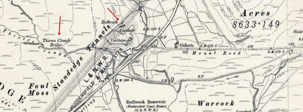 7. Hi there folks, It knows we’re here! I think this is the most foreboding building I have ever encountered, a windowless giant with a face of despair. The way it leans over adds to the chilling atmosphere. To get a sense of size the archway on the lower left hand side has a blocked up gated entrance. The gate is twice the height of us. Inside is a portal to the underworld, a sight never to be forgotten. It breathes, it is alive! You’ll no doubt be thinking what is it, and where is it? Welcome to the area known as Thieves Clough on Marsden Moor. We’ve come to have a look inside the former Redbrook Engine House which is situated midway between Diggle (Greater Manchester) and Marsden (West Yorkshire). Redbrook Engine House and Thieves Clough Bridge (see later info) arrowed It lies directly above the Standedge Tunnels and contains two of the eight ventilation shafts which serve the tunnels. The Standedge Tunnels from Diggle To Marsden showing the present day numbered shafts in use Continues below: