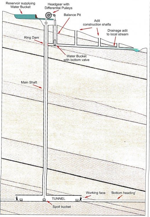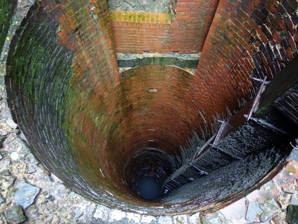 5. Continued from above: Let’s have a look inside now. It’s not easy to get into. The original entrance has been securely gated and the only access is through a small hole in the side of the building. The hole is at head height and has an arch above it which restricts movement through it. If you go through head first it’s a sheer drop of equal height on the inside so it’s a case of turning around as you go through. Easier said than done! I was just waiting for part of me to go pop or twang as I folded myself double to get through. The small arched hole in the lower level proved challenging to get through! This place ranks in my top three. Once inside it’s like being in a roofless medieval fortress. The walls tower above to the sky. At each end are the two shafts constructed in 1796. They are mainly rock cut and lined with bricks. One of these is over the Canal Tunnel, the ‘Bye Pit’ or ‘Upcast Shaft’, while the ‘Engine Pit’ or ‘Downcast Shaft’ is offset over the rail tunnel. The ‘Engine Pit’ was constructed like this to avoid the pump rods from the engine and the sump for the pump obstructing the tunnel works. Both shafts are completely exposed and just right for falling down. They measure seven and nine feet across respectively, and are easily big enough to drop a Nissan Qashqai size vehicle down. The most frightening dimension however is the depth. Both drop down just short of 500ft! (Blackpool Tower is 518 feet high). Looking down the ‘Downcast Shaft’ (over the rail tunnel) you can see a fog hovering owing to the difference in temperature. If you’re fortunate enough to be in there when a train goes through the tunnel you are in for an experience which you’ll never forget. It beats any ride at Alton Towers. You have to lay down with your head leaning over the abyss. It all starts with a deep rumbling from within the vent. You first see the fog start rising up which is then followed by a cataclysmic up draught. It is impossible to keep your head from being blown back by the violent buffeting. When this has subsided yellow flares appear momentarily as an eerie warm blue mist drifts up. These are the diesel fumes. As the train passes the next vent the pressure in the tunnel causes a massive down draught which reverses the airflow and sucks all the air out of the area above the vent. Suffice to say I didn’t hang about the edge for that part. I poured some water around the top edge and stepped back. It was instantly vapourised as the air violently blasts its way back to the depths. All was quiet once more and as I looked back down the mist had started to form again. Continues below: