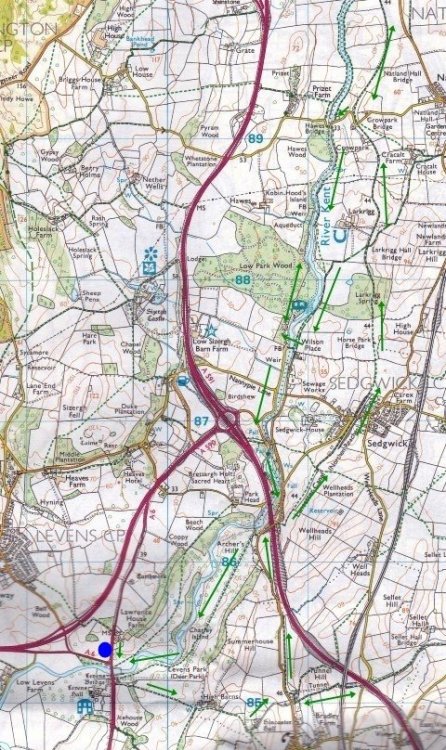continued from above Let’s head off now then along the old route. The pics in the gallery follow this exactly. The start and finish point is the blue circle bottom left, and the route follows the green arrows anti-clockwise. The canal bed is at a consistent 144 ft elevation along this entire section which is a tremendous achievement considering the era it was constructed. Leaving the layby we walk alongside the A6 and cross over the River Kent. Shortly we turn off to the left and enter the path that heads to Hincaster. Immediately alongside us is an outbuilding linked to Levens Hall. It dates from the late 1500’s and has a fine studded door. In the field to our right is a more recent addition of a wartime pill box. We soon pass Hincaster Hall which also dates from the late 1500’s. Beyond this is the horsepath which leads to Hincaster Tunnel. Owing to the canal not having a towpath through the tunnel the horses had to be taken over the top. Along here are two tunnels built by the canal company in 1817. They were constructed to allow farmers to cross the bridge above to access their fields and were known as accommodation bridges. A third tunnel dates from 1846 and was built by the LNWR when the main London to Glasgow railway line was constructed above. The end of the horsepath leads to the eastern side of the canal tunnel. Built in 1816 it is an impressive sight. The fully laden barges had to be ‘legged’ through, or if they were really carrying some excessive weight pulled through by ropes and chains. Returning over the horsepath we head north and arrive at the western end of the tunnel. Here the fixing rings for attaching the pull through chains are visible in the tunnel wall. Continuing on we pass through a wooded area. Here the trees have had various things attached to them for children to discover. We cross over the A591 and enter a field. You would never know a canal had existed here. The land slopes downhill, and there is absolutely no trace until the first canal bridge appears. This is Wellheads Bridge and is literally in the middle of the field. A surreal sight for sure. Soon we enter Sedgwick. The village has around 350 residents but no shop, no pub, and no church. Its main point of interest is Sedgwick House. This was built in 1868 for the Wakefield family who owned the gunpowder works by the River Kent (we’ll come to that later). There is a fine example of a skew bridge here. Initially bridges were built at a right angle to the canal, creating a Z bend in either road or canal. Skew structures got around this. To avoid weakness across the bridge a winding course of stones were used, whilst creating the smallest span. Leaving the village behind we come to our second bridge at Horse Park. Again, in the middle of a green expanse. From the top of this you can make out a faint darker green strip where the canal would have been. Things to look out for here are the towrope marks. These were caused by the wet ropes which would have had grit etc. embedded in them being pulled around the bridge corners. An attachment hole can be seen for the steel plates which were added to protect the stonework. A fossilised sea anemone is visible on one of the limestone blocks in the bridge wall. A wooded area then follows. The smell of wild garlic here is tremendous. Larkrigg Hall Bridge is next. This one is a gem. The archway still has the painted white outline. The towpath, bridge number plate and a benchmark which was used when surveying the route are all at hand. In addition to this the canal bed has not been filled in here so it is a good place to see the lie of the land. Close by is an old milestone. As these were approached by the barges it shows the distance from the last place behind, not the distance to come. It is confusing until you know the reason why. It was for assistance in showing how far goods had been carried and to ensure the full toll was paid. After this we come to a fence line dividing the canal bed. One side has been filled in, whilst the landowner on the other side has left it as it was. Next on our journey is Natland Hall Bridge. The village dates from the 1100’s. There is a long standing legend that Natland has a treacle mine! The secret is only known to a few village elders. The rumour goes that a man exploring a cave back in 1211 found a spring of treacle. More recently an old farmer said he used the treacle on his farm for his animals due to its healing properties. He said it was not like Tate and Lyle’s but is solid and can be melted by heating. When asked where it could be found he replied with, “Can’t rightly say! It could be near the Kendal Mint Cake Quarry!” A treacle mine cart! This bridge has a large crack down one side and is not quite symmetrical. The canal from here into Kendal tends to lose its appeal as it becomes more urban and surrounded by industrial units. We’ll turn around at this point and head back south a short distance where we’ll leave the canal and head for the River Kent. Alongside the river is Hawes Bridge which dates from the 1700’s. The body of Sir Charles de Leyburne of nearby Cunswick Hall was washed up here after being murdered by his son and thrown in the river. Keeping alongside the river we come to Wilson Place. Here is a suspension bridge dating from the 1870’s. This is a replacement for a wooden bridge that was washed away in a flood. It contains reused suspension rods from a disused bridge in Scotland. The crossing of the river here was to enable workers from Sedgwick and Natland to gain access to the new Sedgwick Gunpowder Mill. Let’s cross the bridge (max capacity 25 persons) and have a look to see what’s left. Gunpowder was the only explosive available for military use, and for blasting in mines and quarries until the mid-19th century. Water powered mills had been in use since the 1500’s gradually being replaced by steam power from the 1900’s. The production process goes through eight stages. First