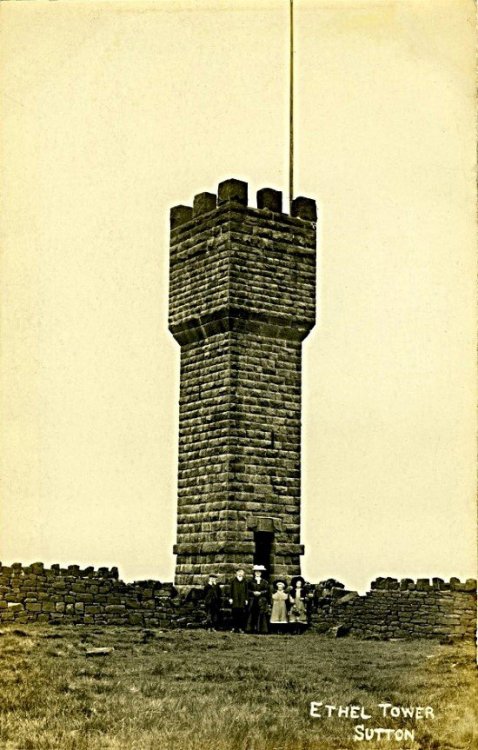 (continued from above) Notwithstanding a connection they both have an interesting history attached. They both sit at opposite ends of a rocky outcrop known as Earl Crag. Let’s start with Lund’s Tower (additionally known as Sutton Pinnacle, Ethel’s Tower and Jubilee Tower). William Lund had made his fortune in the textile manufacturing business. His son James bought Malsis Hall across the valley in 1860 and replaced it with a vast mansion. Malsis Hall was replaced with this fine mansion. In 1887 he commissioned a firm of local architects to design a monument that could be seen from the grounds. The tower was believed to have celebrated his daughter Ethel’s 21st birthday. It gets its Jubilee name from the commemoration of the jubilee of Queen Victoria. The tower played a role in the celebrations for another of Lund’s daughters. To mark the occasion of Marion Emmeline’s marriage a huge flag was floated from the top. The flagpole remained for a number of years afterwards. Amazingly the doorway is not blocked and you can climb the dark and narrow steps to the top. The old flagpole on the tower. Pic credit to Dave Martin. (continues below)