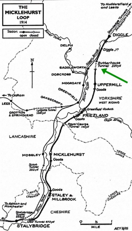(continued from above) The Micklehurst Loop was a double-track, six and three quarter mile alternative route between Diggle and Stalybridge on the Huddersfield-Manchester line. The loop was spread over the borders of the West Riding of Yorkshire, Lancashire and Cheshire. The attached route map shows our tunnel marked by the green arrow. Why was the loop constructed? The Huddersfield and Manchester Railway Company (1844) was amalgamated into the London and North Western Railway in 1847 after the LNWR had recognised the potential of the line. It provided an economic link between Leeds, Huddersfield, Manchester and Liverpool. The textile manufacturers of the Colne and Thame valleys would also add to the line’s profitability. The history of this major line would cover many pages so we’ll just concentrate on its association with the loop. Such was the success of the Huddersfield-Manchester route that two tracks proved totally inadequate to handle the traffic. The original single-track Standedge Tunnel (1849) had been quadrupled by 1894. Further south, industry and housing on the western side of the valley crowded the route. It was impossible to squeeze extra railway tracks into the space without extensive demolition and expensive engineering. The solution was to layout an entirely new route on the eastern side of the valley. Even this involved some complex engineering challenges. Three tunnels, five viaducts and four stations all had to be constructed. The industrial nature of the valley required goods depots and sidings to be provided at regular intervals along the route. All of this needed expanses of flat and level land which had to be created from the steep valley sides by cutting or tipping. During the construction there were some engineering setbacks and accidents, and customary outbreaks of violence involving the navvies. An innovative method of working through the night illuminated by powerful electric lamps was trialled here. It attracted onlookers to the scene who thought it was like Blackpool prom! The line opened fully to passengers on May 1st 1886. The loop’s passenger service soon proved to be little used as the four stations were in effect duplicated and served by the main line. All four had closed to passengers by 1917. The loop remained very important, however, for goods traffic, and as a relief line for summer excursion trains. BR’s north-eastern region timetable actually used this route as a priority over the main line in busy periods. The four former stations remained in use to handle the goods traffic until the 1960’s. Freight was now switching to road transport and the line’s use declined. It was decided that the original double track on the western side of the valley would be sufficient for the Huddersfield-Manchester route. The last passenger train to use the loop was a Pennine Railtour on Sunday October 2nd 1966. The line was closed to through traffic the next morning. The track was lifted by 1970 with the exception of about a mile at the southern end of the loop which remained in use to carry coal to a power station. This ceased in 1972 and the remaining track taken out of use by July 1976. We’ll have a look around another part of the Micklehurst Loop in the future. (continues below)