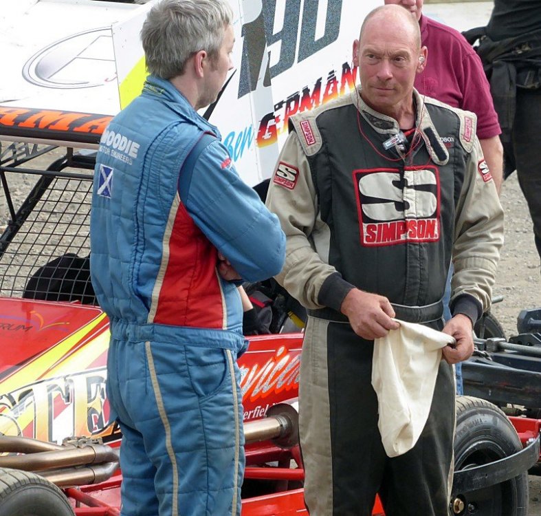 THE SALTIRE SWEEPS SKEGNESS Gordon Moodie races to a dominant Heat and Final at Skegness on Saturday. Gordon's giving Rob some tips on how to win Heat and Final at his own track! Every credit to Rob and the team for meeting the challenge of re-opening the stadium. All was in place for a top night of action. Richard Kaleta announced a few changes over the p.a concerning race winners presentations. There wouldn’t be a pace car, trophies, or driver interviews. No drivers or mechanics to go to race control. Spectators to clap or sound air horns. There was a one way system in and out of the pits for anyone who qualified for access. Heat one for the F2’s saw Billy Webster (226) race his tar car. Speaky got a rear flat. Brad McKinstry (NI747) and Dave Polley (38) were up front early on, and joined by Neil Hooper (676) who was dishing out the front bumper with gusto. Another hitting hard was Dan Fallows (581). Ministox graduate Harley Burns (992) drove a fine race to claim the win. Result: 992, NI747, 676, 190, 9, 376, 38, 226, 581 and 960. First ten to the Final. Heat two saw an epic battle for the lead between Aaron Vaight (184), Gordon Moodie (7), Jon Palmer (24) and Liam Bentham (488). James Riggall (527) was fired into some parked cars in turn four by the 24 car. An emotional Gordon dedicated the win to his Uncle Jimmy and Auntie Anne. Result: 7, 184, 488, 24, 606, 183, 390, 42, 731 and 319. The Consolation had Speaky and Mark Gibbs (578) trading some big hits. Result: 783, 527, 282, 200, 482, 524, 618, 161, 218 and 578. The Final began with Guinchy (183) being steamrollered into the turn 3 plating by a hard charging pack of star men. The resultant damage couldn’t be repaired in time for the GN. Gordon piloted the 7 car to the front in supreme fashion. That youngster Harley Burns took some catching though. Definitely one for the future. The two Polley built cars finished together in 4th and 5th. Result: 7, 783, 992, 38, 488, 218, 581, 190, 9, and NI747. The GN had good pals 184 and 24 take the top two placings, with 488 following his car builder 38 home in 5th and 6th this time. Result: 184, 24, 783, NI747, 38, 488, 190, 578, 226 and 218. Ministox top three results: Race one: 180, 68 and 277. Race two: 45, 269 and 180. Race three: 68, 45 and 269. Final: 68, 180 and 27. V8's top three results: Race one: An all girl top three – 154, 525 and 8. Race two: 288, 154 and 8. Final: 288, 154 and 438. GN: 176, 466 and 222. In the Saloons Karl Hawkins (75) was having a go in a hire car racing from the yellow grade. Deane Mayes was well and truly cannoned in by Simon Venni. Speaky (318) was one of the fastest all night. He passed Diggy (116) and Billy Smith (161) with ease and was so much quicker coming out of the corners. He was really getting stuck in with some big hits being dished out. He was enjoying himself immensely especially fighting back after getting spun out a few times. Top three results: Race one: 120, 600 and 116. Race two: 902, 349 and 161. Final: 368, 341 and 120. An excellent night of incident packed tarmac racing at its very best. Many thanks to all the drivers for the entertainment. Pics in the gallery.