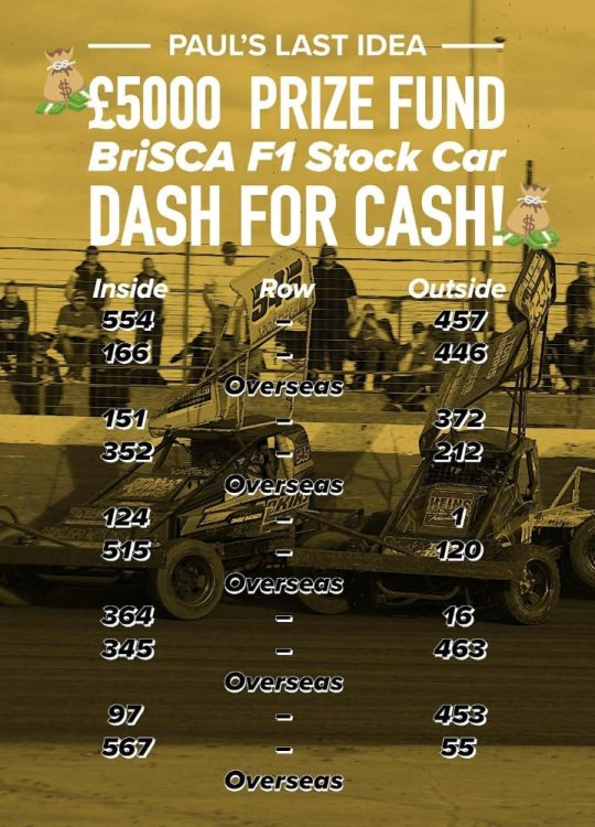 We are proud to present the line up for Paul Butlers last idea – the £5000 prize fund Dash for Cash. The grid is attached for the last race of World Final Night and we are happy to advise the prize fund will be paid as follows: 1st - £3000 2nd – £500 3rd - £250 Best Overseas not on the podium - £250 Best Yellow Grader not on the podium - £250 Best Blue Grader not on the podium - £250 Best Red Grader not on the podium - £250 Best Bumper Work – determined by Race Control - £250 If a driver is unable to take their place; the grid will move up and the following reserves in order will be drafted in- 67, 138, 346, 525, 93, 127, 587, 259, 526, 268 Make sure you stick around to the end; who will be taking the money? We’re sure it will be a fitting final tribute to the late, great, Paul Butler.