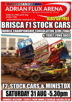This Saturday, 31st August – what a simply huge night of BriSCA action this meeting has developed into – two BriSCA formulas with lots to play for. Drivers from across England, Holland and New Zealand are coming to race with us. A pre World Final showdown, with the formulas best racing, the Consolation Semi Final and BSCDA Trust Fund trophy, plus more. Turning out in numbers that can only be bettered by the World Final, along with full grids of BriSCA F2’s – a night you do not want to miss! There are currently 79 F1 Stock Cars and 56 F2 Stock Cars (Fully booked) booked in to race. Early event details can be found here: http://www.stockcar-racing.co.uk/content/news/sat-31-aug-530pm-preview.ashx Action packed entertainment for family and friends at the Adrian Flux Arena. -