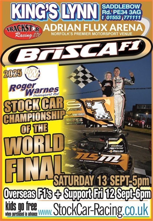 10. Trackstar are delighted to announce that the 2025 BriSCA F1 Stock Car World Final will take place at King’s Lynn on Saturday 13 September 2025 (Start 5pm). This will be an F1 Stock Car only event such is the high level of interest from drivers on both the UK and Mainland Europe. We are proud to be partnering with Roger Warnes Transport Ltd who will be sponsoring the event. Racing also takes place on Friday 12 September (Start 6pm) when there will once again be a full meeting for overseas drivers plus support. In past seasons this meeting when it has taken place at King’s Lynn has often been voted one of the meetings of the season and is tremendous way to kick off the World Final weekend and our thanks go to the Dutch F1 promoters for their assistance with this event in 2025. We did want to run a three day World Final weekend like has been the case for the last two years. As most fans will be aware the World Masters which is the Sunday meeting is one of the rights which are owned by Spedeworth which is why a three day weekend happened at Northampton in 2023. Spedeworth were happy to do a deal with Skegness for this to be repeated in 2024 with drivers in tarmac cars for the World Final and not really looking to support a shale venue the following day. However, with the World Final being on shale and particularly with it being at King’s Lynn - with Spedeworth having shale venues nearby – we were not able to do a deal to be able to run the World Masters this year. Whilst we are naturally disappointed with this, we do respect Spedeworth’s decision on this matter and we are sure they will put on a fantastic meeting on the Sunday. This leaves us with two tremendous events to look forward to at King’s Lynn in the same way King’s Lynn World Finals have been put together over the past few years and we are very excited for the 2025 BriSCA F1 Stock Car Roger Warnes Transport World Final. Further information on this event and tickets will be released next year – probably around February / March time. Press Release 17th October 2024
