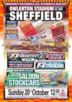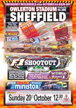 SHEFFIELD 20th October 12.30pm Its all confirmed, its been hard work but ever one had pulled together to make this happen and the rescheduling to Sunday 20th looks even better than the rain off date! More F1s - 6 races and thanks to great co operation of the NMSC with now Ministox alongside BriSCA F1s! As well as World QR for F1,S and Shoot out it is also a shoot out round for Ministox and Reach for the Stars competition It had been a slog, only finalised at 19pm last night - please we do it for you and we and the drivers hope you all will support it particularly with the huge effort and commitment made! Gates open 11am Racing starts 1230 AND a good forecast! Restaurant carvery. Please book direct with stadium on 01142340374