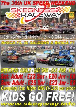 Start times 5pm Saturday, 12 noon Sunday. F1 plus F2 and Saloons The place to be for the biggest stock car weekend of the year: the three main stock car formulas all at one place for two days of non-stop racing. BriSCA F2 Stock Cars - around 90 F2s will be here to qualify for the UK Championship, the current holder is Gordon Moodie. There will be cars racing from all parts of the UK, plus Drivers from Northern Ireland & mainland Europe. With all of the top driver in this formula at Skeggy, it's no mean feat to win the coveted UK trophy. Qualifying for the UK takes place on Saturday night with points scored carried forward to Sunday, and drivers from the two Consolations on Sunday making up the 36 car UK Championship grid. The 2L Saloon Stock Cars, who often steal the show where ever they race, will be joined by drivers from Scotland, Northern Ireland and for the first time for several years, visitors from mainland Europe are entered to race. The Saloons race in the heats on Saturday night with the top 24 points scorers going forward to Sunday's UK Championship. A last chance race on Sunday makes up the 32 car grid. The current UK Champion is Max Stott. BriSCA F1 Stock Cars are the third formula of this weekend. With around 48 cars racing it's going to be good hard fast racing. The now traditional Teng Tools World Champions Challenge will commence at 3pm on the Saturday with a meet and greet session for F1 World Champion Stuart Smith, F2 World Champ Gordon Moodie and of course your Saloon Gold Top Max Stott. However, the situation with Stuart's retirement from racing means at this stage we cannot confirm the details regarding the time trials as yet, but we do have a couple of options and a time trial will go ahead in a F1, a F2 and a Saloon and will involve both Gordon and Max. More details to follow in the future. Don't forget the late night bar and disco in the main bar. Party the night away with the Speaks!