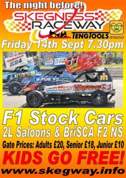 Friday 14th September F1 Overseas visitors plus Saloons and F2. Car park opens 4pm Gates open 4.30pm Adult £20 Senior £18 Junior £10 Kids 12yrs & under - no charge. Advance ticket holders for the two days must exchange their tickets for wristbands at the turnstiles which will allow you easier entry on Saturday. Saturday 15th September F1 World Championship Final plus Saloons. Car park opens 10am. Gates open 10.30am Adults (16-65yrs) £40 Senior (65+ yrs)£38 Junior (13-15yrs) £15 Kids 12yrs & under no charge Advance tickets must be exchanged for a wristband before entry. Please note advance discount tickets are no longer available. Parking There is no parking allowed on the roadside, behind the Grandstand, stadium frontage or normal carpark. All non-camping vehicle parking (except for blue badge holders / Officials / Sponsors / VIPs, who may park in the normal carpark) must be on the field at the North end (Seaside end) of the Raceway. There is a £2 charge per vehicle. Camping All overnight camping must be in the farmer’s field at the back of the Raceway. Use the entrance near the car on the pole. It's £20 per night per unit. If you arrive on Friday then you must pay for both days at the camping entrance. Camping is only available on 14th & 15th - please leave early on Sunday morning. Admission is via the turnstiles only. Grandstand seats Tthere are some seats available they will be on sale from the Trackshop. Friday £5-00 per person, Saturday £15 per person. Due to the high cost of the seating all seats must be paid for including under 12yrs. Wheelchairs Designated wheelchair viewing is on the seaside bend only. Once inside the arena turn left for access. There is no access if you turn right. Chairs Chairs or Seating of any description are not allowed in to the Stadium on either the 14th & 15th September. Food policy In line with other Stadiums and Sports venues, you may enter the Stadium with a small amount of food and non-alcoholic beverage suitable for one person’s consumption e.g., Sandwich, packet of crisps and bottle of soft drink. We will not allow cooler boxes, holdalls, shopping bags, backpacks etc filled with refreshments. Nor will we allow trays, packs crates etc. of soft drinks. STRICTLY NO ALCOHOL or GLASS Alcohol will be confiscated No tents, shelters, gazebos, marquees, pop up tents or similar are allowed inside the Stadium Arena. Trackside parking is no longer available.