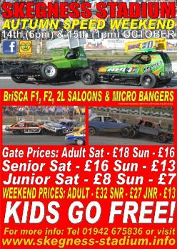 From skegness-stadium.info We welcome back to Skegness Raceway for the last Brisca F1 meeting of 2017 the big league Brisca F1 Stock Cars with Brisca F2, National Mini Stox & F2 Micros are on Saturday 14th October with support formulas on from 6pm and Brisca F1 from around 6-30pm. It’s Brisca F1’s NPC round six sponsored by J. Davidson, and also a WCQR for 2018. The ground will shake as the F1s take to the tight tarmac track, under the floodlights at Skeggy where it always appears so much faster. Early booking list shows all of the shootout drivers taking part, including World Champion Nigel Green & Dan Johnson who is also racing all meeting on Sunday 15th October in a 2L Saloon Stock Car, something to look forward to. Micro F2’s are such a popular formula here at Skeggy & this round is sponsored by Green Haulage & Plant Hire, please make these youngsters welcome as they put their heart & sole into racing, remember how young they are? Pit gate opens at 2pm Turnstiles open at 3-30pm Admission price for Saturday is Adults £18, Seniors £16, Juniors £8 and under 12years no charge. Admission price Sunday is Adults £16, Seniors £13, Juniors £7 (but note that F1s are only on Saturday) Two meeting saver: Adults £32, Seniors £27, Juniors £13. It is all pay at the gate.