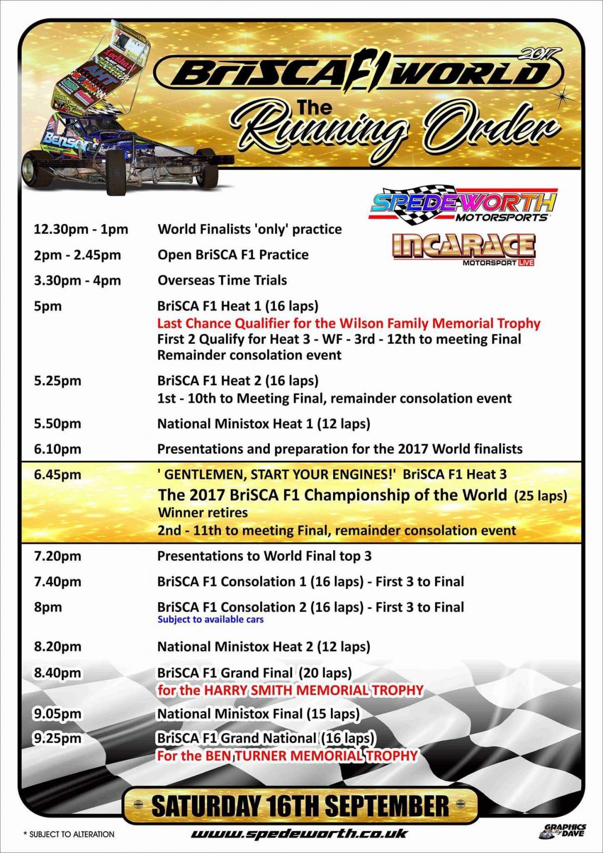 Press release from Spedeworth BriSCA F1 World Weekend The 2017 BriSCA F1 World Championship takes place at Foxhall Heath Stadium, Ipswich on Saturday 16th September but the weekend's race action doesnt start there! On Friday 15th September 2017 Mildenhall Stadium roars into life at 7.15pm featuring the 2017 BriSCA F2 Stock Cars World Of Shale Championship and the National Saloon Stock Cars which never fail to produce top quality action at the shale venue. Admission prices for the event are as follows:- General Admission:- £17.00 Concession : Child (5-14yrs):- £7.00 Concession : 65yrs & Over:- £14.00 Family Ticket : 2 Adults & 3 Children:- £40.00 After the last race of the night is complete the bar will be open for the after meeting social and free camping is available at Mildenhall Stadium for anyone wishing to stay at Mildenhall overnight before heading to Foxhall Heath Stadium, Ipswich the following day. Foxhall Heath Stadium is approximately an hour up the A14 from Mildenhall Stadium for those planning to stay on. Speaking of the following day.its time for the Big One! On Saturday 16th September 2017, Foxhall Heath Stadium, Ipswich welcomes the BriSCA F1 Championship Of The World for only the second time in history! An event that is purely about the BriSCA F1 Stock Cars and crowning a new World Champion OR could the title be retained by Frankie Wainman Jnr? Dont miss this one as only time will tell! Advanced tickets are available for this event which offer big discounts on ticket prices compared to the turnstiles admission prices on the day. Tickets can be purchased via the following options:- Option 1:- You can order your tickets online for general admission tickets and choose to have them either sent to you in the post or collect them from the stadium on the day of the event. For grandstand tickets please use option 2. Visit www.incarace.co.uk to be re-directed to the online shop. Option 2:- General admission and grandstand seating tickets can be purchased by calling us on 01252 322920 and providing your details over the phone. Office hours are Monday Friday, 9am to 5pm. WORLD CHAMPIONSHIP : GENERAL ADMISSION : ADVANCED General Admission:- £35.00 Concession : Child (5-14yrs):- £18.00 Concession : 65yrs & Over:- £30.00 WORLD CHAMPIONSHIP : GRANDSTAND : ADVANCED General Admission:- £48.00 Advanced tickets are available to purchase until 4pm on Thursday 14th September 2017. WORLD CHAMPIONSHIP : GENERAL ADMISSION : TURNSTILE PRICE General Admission:- £45.00 Concession : Child (5-14yrs):- £28.00 Concession : 65yrs & Over:- £40.00 WORLD CHAMPIONSHIP : GRANDSTAND : TURNSTILE PRICE General Admission:- £58.00 For people who are collecting their advanced tickets on the day, the advanced ticket collection point will open at 10am. Turnstiles for advanced ticket holders will open at 11am and for race fans purchasing tickets on the day at 11.30am. On-track activities start at the 12.30pm which includes practice and the overseas driver time trials and the first race of the night fires into life at 5pm! Full details of timings will be available soon. At the completion of the event we need to remind everyone that there is no camping permitted at Foxhall Heat Stadium, Ipswich overnight! However, free camping will be available at Northampton International Raceway which is approximately 2 hours away via the A14, A45 then A428. Northampton International Raceway camping will be open into the early hours as we appreciate it will take time for people to travel from Foxhall to the raceway. Day three! World Masters day featuring the BriSCA F1 & F2 Stock Cars and this year we welcome the V8 Hot Stox to complete the line-up. First race starts at 12noon and a full race programme will be on the cards for the three formulas. Advanced tickets are also available for this event plus pay on the day tickets at the turnstiles. Discount prices once again apply for advanced ticket holders and the admission prices are as follows:- WORLD MASTERS : ADVANCED General Admission:- £20.00 Concession : Child (5-14yrs):- £8.00 Concession : 65yrs & Over:- £16.00 Advanced tickets are available to purchase until 4pm on Thursday 14th September 2017. WORLD MASTERS : TURNSTILE PRICE General Admission:- £22.00 Concession : Child (5-14yrs):- £8.00 Concession : 65yrs & Over:- £18.00 The World Masters is the perfect event to round off three days of pure stock car action finishing at Northampton International Raceway which is one of the spiritual homes of BriSCA! We look forward to seeing all drivers, race fans and officials over the three days! -