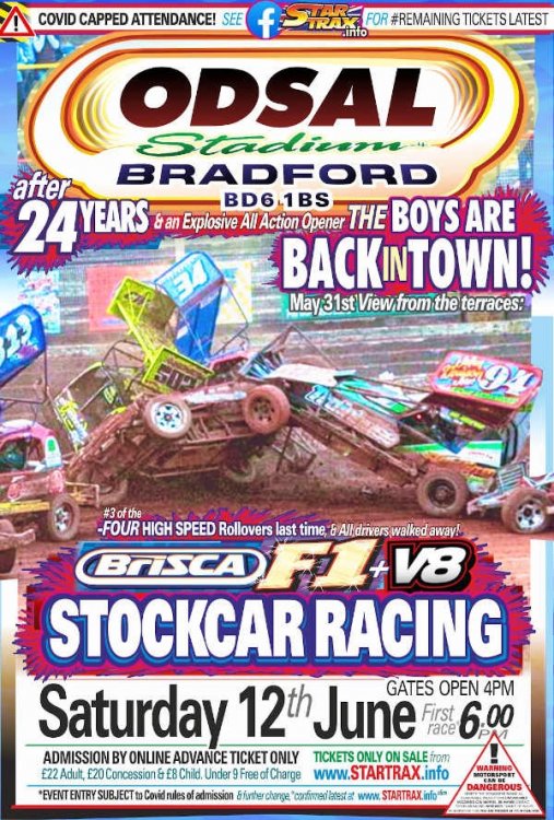 22. UPDATE ON TICKETS 12th & 13th June BriSCA Weekender! As you are aware, we continue to work on restricted capacities until AT LEAST after 21st June. Therefore this weekends 'double header' at Bradford & Sheffield are again restricted - Odsal does have 4 x times capacity to Sheffield which is a positive however, we hope for a sell out at Odsal - Sheffield is curtailed to just under 1000 and numbers are running down for both - but particularly Sheffield - Those in 'driver bubbles' should ensure you get your tickets asap, with Sheffield the lowest availability. F1 & F2 bubbles are 6 per car