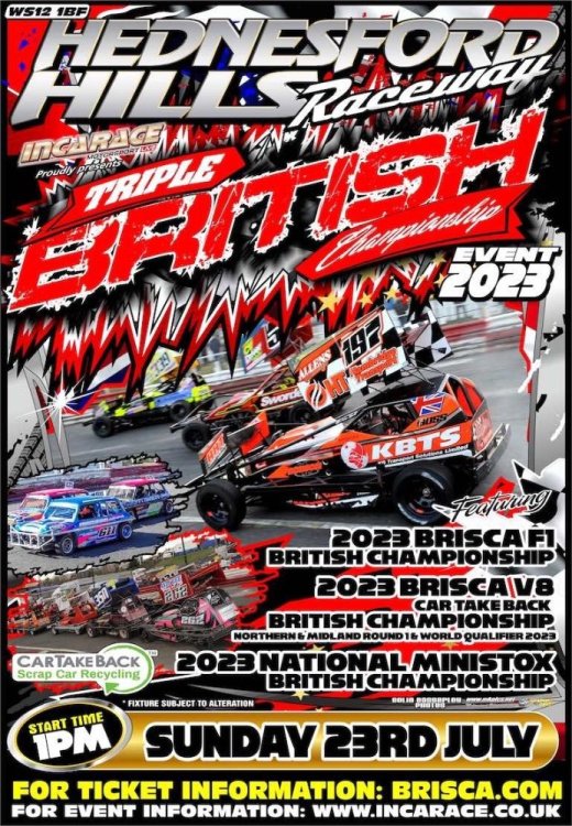TRIPLE HEADER BRITISH! Following on from the 'other' British [ GP ] we move on to BriSCA's big one! The 2023 BSCDA BRITISH DRIVERS CHAMPIONSHIP which, once again returns to the wide sweeping, high speed curvature of Hednesford Hill's Raceway in Staffordshire on Sunday 23rd July at 1.00.pm One only has to 'flashback' recent years to it's highly acclaimed staging when Hednesford last hosted this coveted title, second only to the World. the ampi theatre that IS Hednesford, it's sweeping 1/4 mile oval configuration let's the cars harness the power and when the hit's come, they come BIG! Facilities are first class with two huge race view Grandstands, ample fast food catering and bars and spectacular views all around of the gladiators in action. Complimenting the BriSCA F1 show are the National Ministox and V8 Stock Cars with both formulae also competing their British titles. Further details will be released in coming days - ADVANCE TICKETS are available now https://www.ticketebo.co.uk/BriSCAF1 -