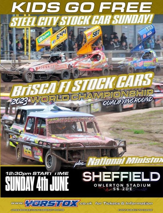 Adult - £22 Concession - £20 Child (10-15) - £12 Child (9 and under) - FREE Family - £60 BriSCA F1 are back in town at Odsal Stadium, Bradford on Saturday 24th June for an evening of racing as they compete in the final World Qualifier. As always this event will kick off with a White and Yellows race. To add to that we have the stars of the future being the National Ministox. These youngsters will be getting some well needed track time as we look forward to hosting the National Ministox National Championship (Gold Roof) in September. Odsal Stadium is classified as an elite stadium, this does mean there is certain protocol that must be followed which is out of the hands of YorStox. Please note: • No Glass Bottles • No Pressurised container cans • No Alcohol to be brought in • Small amount of food is permitted If for any reason you encounter issues on the day we ask you please to approach a member of the YorStox team, they will be wearing a yellow Hi Vis with YorStox and STAFF on the back to raise a concern so that we can deal with this on the day. Advanced tickets are available by visiting https://www.yorstox.co.uk/Tickets Once a ticket is purchased via the site, you will recieve a QR Code to the email address provided (please check your junk mail). This code will grant you access to the stadium on race day. If you are arriving separately, you can 'transfer' tickets via the FIXr website to split down your booking, without this you must arrive together. QR codes will only be valid once so please do not try to forward this on. General admission tickets will be available to purchase on race day from the turnstiles entrances, we have a large stadium capacity and we will not sell out on the day. Cash and Card payments taken. Programmes will also be available from the turnstile entrances. The stadium boasts great viewing from all areas, including a 4000 covered seated grandstand (no extra charge). Please note you cannot reserve grandstand seats prior to the event. Food and drink outlets are available including licenced bars all around the circuit as well as trade stands which are located on the turnstile bend where you enter the stadium. South Stand Upgrade tickets are avaialble for this meeting and should be purchased via the YorStox website. These are priced at £40 per person. Please note the cost is the same for all tickets (Adult/Concession/Child) as it is a cost per person inside the hospitality. This includes balcony viewing and a raceday programme. Parking, food or drink is not included in the price. Toilets are available all around the raceway including disabled access and baby changing facilities. Disabled parking is available around the back of the stadium along from the Q Gardens pub, please note spaces are limited and these cannot be reserved. General car parking can also be found here along with across the road at the Council Operated Richard Dunn's Centre (£7 per car charge). If you do not use these parking facilities please ensure you park sensibly and avoid using nearby housing estates as this will impact the future viability of the raceway. Please note the Richard Dunn's facility is a council operated facility and we thank them for their continued support. There is no general access to the pit area for Health and Safety reasons once racing begins Strictly NO Alcohol or Glass is to be brought into the stadium. No dogs are permitted into the stadium. Details such as stadium opening times and driver booking lists will be updated closer to the event. Thankyou for your support and have a great day with YorStox.