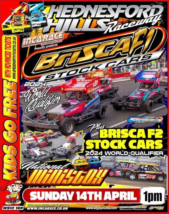 FEEL THE CANNOCK CHASE SHAKE! The mighty BriSCA F1 Stock Cars make their first appearance of 2024 at Staffordshire's Hednesford Hills Raceway on Sunday 14th April - on what is almost 70 years to the day since Stock Car racing started in the UK. Also racing for World Qualifying Points are the BriSCA F2 Stock Cars, with the road to gold continuing for this all-action formula. Racing also comes from the National Ministox, who always provide an incredible spectacle whenever they take to the track: these stars of the future don't hold back when it comes to fast and furious action. Admission Prices (ADVANCED E-TICKETS) General Admission £21.00 Concession : (66yrs & over) £19.00 Concession : Children (0-14yrs) FREE (advance ticket only) Inside Parking £10.00 Advance tickets from https://spedeworthtickets.co.uk Admission Prices (Cash or Card at the turnstiles) General Admission £22.00 Concession : 66 year & Over £20.00 Concession : Children (5-14yrs) Under 5yrs go free £8.00 Inside Parking (Pay on the day) £10.00 Outer (Common Area) Parking FREE Outer (Common Area) Parking FREE Programme £3.00