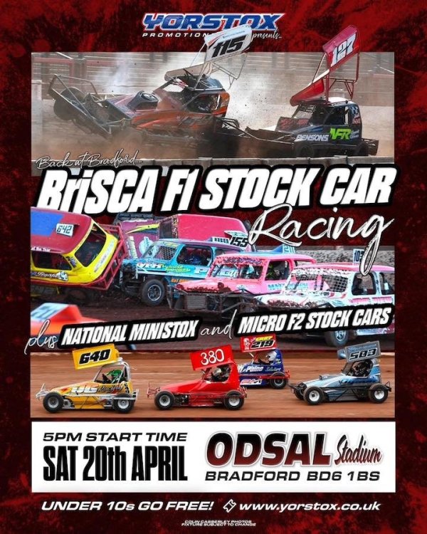 F1 plus Ministox On Saturday 20th April the BriSCA F1 return to Bradford for the first meeting of the season on the Bradford Shale. This event will also feature a Whites and Yellows race which proved extremely popular with drivers in 2023. Also racing we have the stars of the future of the National Ministox, as well as the even younger generation with the Micro F2. You can simpy pay on the day using cash or card from the turnstiles, or check out www.YorStox.co.uk to secure your tickets including the ever popular South Stand Upgrade for just £40 per person including admission. Main Event from 5pm Adults £22 Concession £20 Child (10-15) £12 Child (9 and Under) Free Family (2 Adults & Up to 3 Children) £60 South Stand Upgrade £40 Per Person