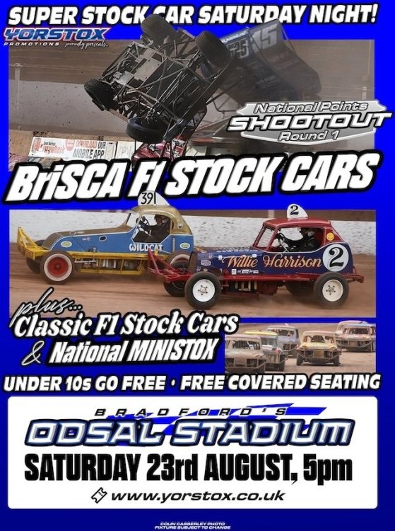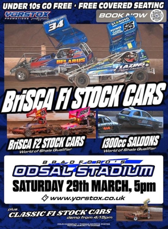 The wait is over, the 2025 season is here and we kick off with 4th season of YorStox Promotions. We have had a great 3 years of racing and we look forward to things keeping improving here at Bradford. This year we are back kicking off proceedings with a Stockcar Frenzy featuring BriSCA F1 competing in their Grand National Championship as the first race. This is a race based on the 2024 season and is often a fiercely fought race. Add to that there is the BriSCA F2 and with still 2 weeks to go nearly 40 cars are booked to race. Bradford plays host to the 2025 BriSCA F2 World of Shale and this event gives drivers both the opportunity to get some all important laps in but also to get points on the doors with this also being a World of Shale QR. If that’s not enough we also have the 1300cc Saloons and Classic F1s on the bill. Classic F1s will be racing two races pre meeting from 4:15pm with the main event starting from 5pm. Admission Prices – In Advance until Wednesday 26th March at 5pm Adult - £21 Concession - £19 Child (10-15) - £11 Child (9 and Under) – Free Family - £55 South Stand Upgrade - £40 Per Person Including Admission Advanced tickets are available by visiting https://www.yorstox.co.uk/Tickets Admission Prices – After 5pm on Wednesday 26th March and on the day Adult - £22 Concession - £20 Child (10-15) - £12 Child (9 and Under) – Free Family - £60 South Stand Upgrade - £40 Per Person Including Admission
