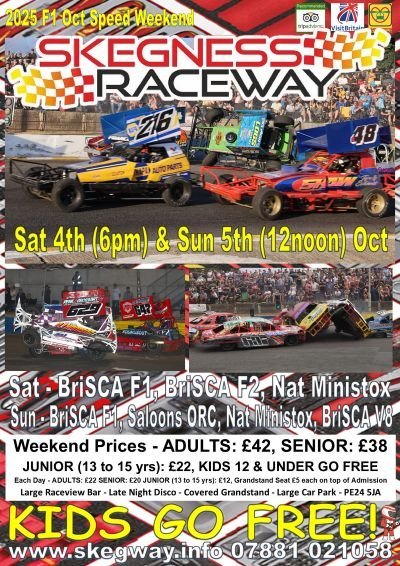 BriSCA F1 October Weekend Sat - BriSCA F1, BriSCA F2, National Ministox Sun - BriSCA F1, Saloon Stock Cars ORC Championship, National Ministox, BriSCA V8 Hotstox Welcome to the Last Speed Weekend of 2025! Racing this weekend are: Saturday – BriSCA F1 Colin North Memorial and National Shoot Out Round (sponsored by Marriott Drilling), BriSCA F2 and National Ministox Sunday – BriSCA F1 Tommy Kay Memorial and Shoot Our Round (sponsored by GBE UK Energy), Saloons Horry Barnes Memorial – ORC Championship and Shoot Out Round, National Ministox and BriSCA V8 Hotstox Get ready for an action-packed weekend at the Skegness Raceway, where adrenaline meets excitement in the thrilling world of stock car racing! Saturday night the BriSCA F1s will be racing for the Colin North Memorial trophy, Colin was a valued member of the stock car community and is much missed. The F1s return on Sunday for the Tommy Kay trophy, Tommy raced and built stock car throughout his life, and he was always on hand to offer help and advice to anyone on the circuit. Sunday’s race is a great way to honour his memory. The BriSCA Ministox are in attendance for both days this weekend, the formula for 11- to 15-year-olds never fails to disappoint with plenty of action-packed racing. Congratulations go to Mason Whittle (183) who recently won the National championship in an exciting race at King’s Lynn. The BriSCA F2s complete the trio of top-class formula in action on Saturday Night. With National Hotrod World Champion out in the Rob Speak car The hard-hitting National Saloon stock cars join us on Sunday, along with the F1s and Ministox, The Saloons will be racing for the prestigious ORCi championship and drivers from all points of the UK will be battling out for top honours V8 Hotstox complete the bill on Sunday, Thomas Brighton (329) won the World championship a couple of weeks ago, it was the second time he has won the title, and he is sure to be among the front runners on Sunday. Plus from Flo Racing in America we have Drake York Drake York was born into a racing family. His dad, Jason York, won two 410 Sprint Car Championships at Silver Dollar Speedway. Drake went to his 1st race when he was 6 days old. He has been going to the races ever since. York first got to announce a heat race at Silver Dollar Speedway when he was 6 years old. York started racing go karts when he was 5 years old running road courses until he was 7 years old. Then started to race outlaw karts in 2011 and stopped in 2014 to pursue a announcing career. Drake has had the privilege to hop on the mic at some of the greatest tracks on the west coast such as; Cycleland Speedway, Silver Dollar Speedway, Calistoga Speedway, Red Bluff Outlaws, Perris Auto Speedway, Marysville Raceway, Placerville Speedway, Ventura Raceway plus many more he now has Skegness Raceway to add to the list! Gates Open: Sat 1pm Sun 9.30am Pitgate and car park opens Sat 12.30pm (inc camping) Sun 8.30am PLEASE DON’T ARRIVE BEFORE OPENING TIMES LISTED This causes us lots of issues if you block the road, also blocking the gates will delay the staff getting in to open up, thanks. Saturday Paid Practice available for the formulas racing on Saturday. 1.30pm to 5.15pm £25 each. Sorry no practice available Sunday. Weekend Advance Tickets are available on www.skegway.info up to Friday 3rd 12noon then its all pay at the gate on the day cash or card. We have a large capacity we won’t sell out The ticketing System in we use will require to have the QR code scanned at the ticket trailer Advance Tickets can’t be used at the pit office. Please note the Pit office is cash only. Do to its location mobile card machines don’t work Gate Prices Each Day: only available on the day not in advance) Adult £22 Senior £20 Junior £12 Weekend (in advance or on the gate) Adult £42 Senior £38 Junior £22 Grandstand £5 each day on top of admission Camping £20 cash only (only available on the Saturday night and isn’t bookable) 12 years and under as always go Free and can be added in advance if required Adults 16yrs and above, Senior’s 65yrs & over, Junior’s 13yrs to 15yrs Card or cash can be used. Sorry there isn’t a cash machine at the raceway. Advance tickets are available on www.skegway.info